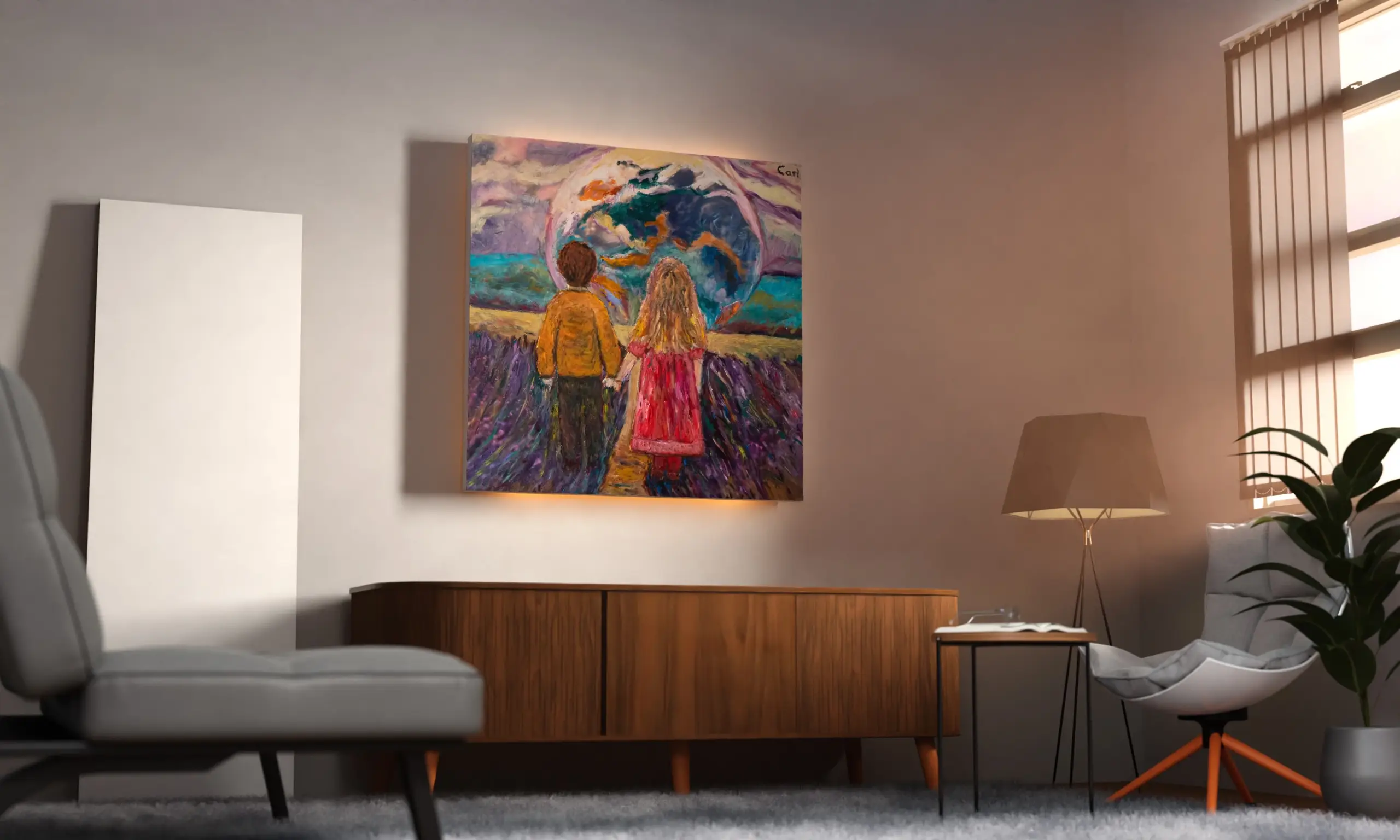 Artwork “Young boy and girl reflection of world” brings intense colors wich highlight the energy and excitement of youth as they explore new possibilities and question what lies ahead. This dynamic piece reflects the sense of wonder and anticipation that accompanies their journey of growth and discovery.